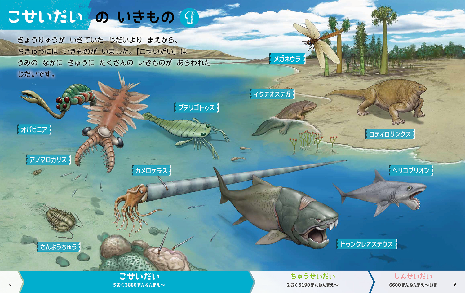 ▲古生代・中生代・新生代に分けて、その時代に生きていた生き物を紹介しています。