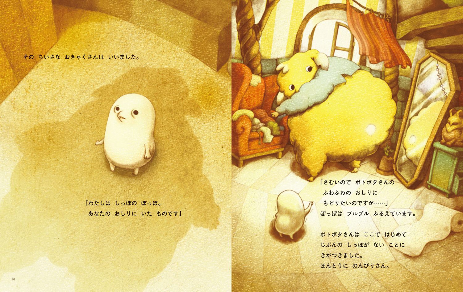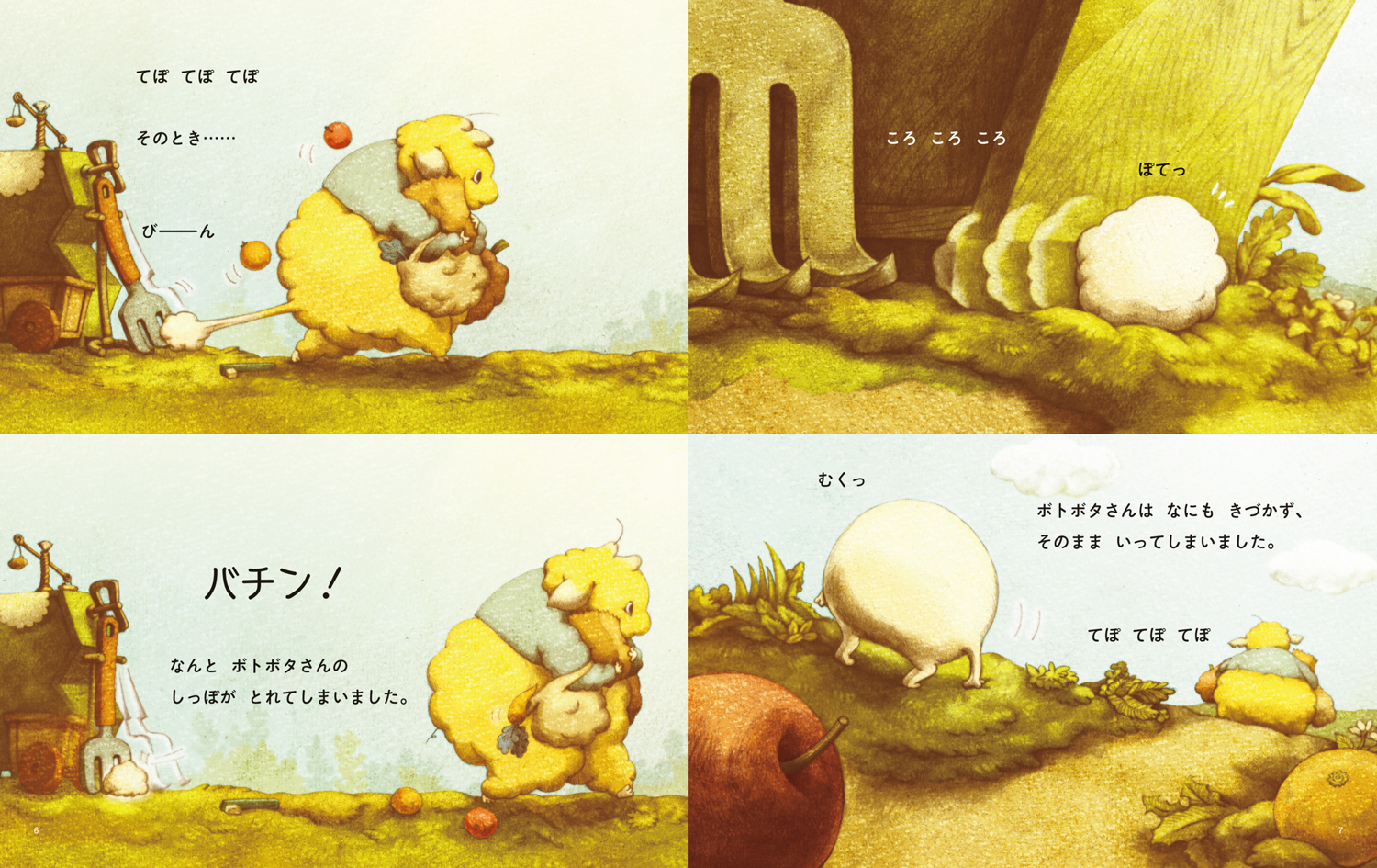 ▲「しっぽのぽっぽ」爆誕! ボトボタさんは、しっぽがとれたことに気づかずに、そのまま行ってしまいます。